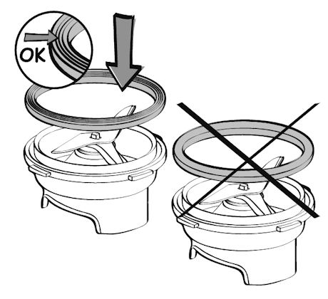• Prüfen Sie, ob die Dichtung korrekt auf der Messereinheit positioniert ist. Nach dem Einsetzen müssen die 3 Falten der Dichtung sichtbar sein. Wird die Dichtung mit der entgegengesetzten Seite nach unten positioniert, lässt sich die Messereinheit nicht im Behälter einrasten.